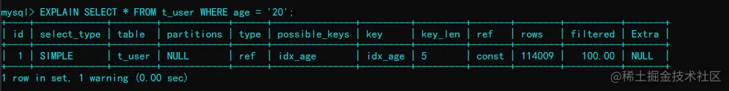 age字段是int类型,使用age='20'查询,还是会走索引。