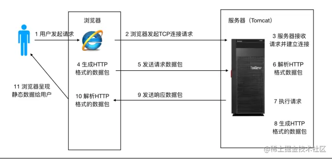 注意:浏览器访问服务器使用的是http协议,http是应用层协议,而具体传输还是使用的TCP/IP协议
