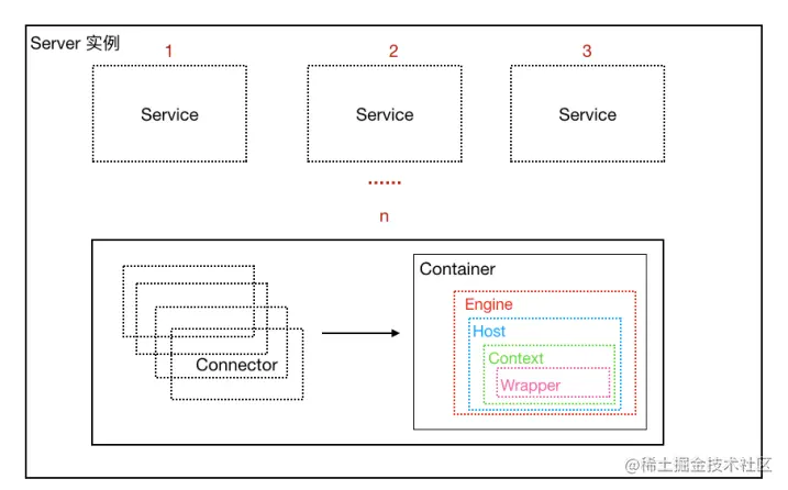 每个Service实例下可以有多个Connector实例和一个Container实例