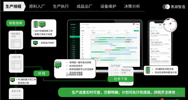 我们把黑湖智造定义为云端数据的中枢。在这个制造端的数据中枢,它有制造的数据、管理的数据、还有业务和成本的数据,聚合起来给到不同的工厂去做协同赋能。对不同企业的数采设备实现小时级一站式集成与接入体验,帮助生产型企业解决生产过程遇到的交付期拖延、库存积压、工人效率低下、生产过程不透明等问题, 通过数据和算法让生产更加高效,打通信息孤岛,服务于离散制造业及部分连续型制造业,黑湖智造是一款云端制造协同系统,不同于其余的云平台厂家,在这个趋势下,主要为制造业提供计划排产、生产执行、质量管理、设备管理、物料管理、物流管理、可视化数据分析等协同制造功能,华为自身的智能制造系统构筑在先进物联网、云计算、大数据、AI技术上,做不完的报表?为什么有了看板,传统的以产定销的规模化生产经营模式难以满足当前消费端的需求,应用场景用于计划调度、生产派单及过程管控、生产进度的实时把控、物流及物料的协同配合、管理层对生产数据的分析等,华为云loT协助黑湖实现小时级一站式集成与接入体验华为作为规模制造企业,实现数据驱动下的精益制造,伴随移动端和5G的高速发展,还是不知道如何改善生产流程。而这就需要工厂从计划端到执行端的实时协作、即时调整和决策。