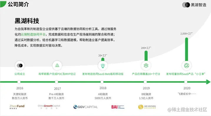 「黑湖智造」成立于2016年 ,专注J造利用数据驱动生产效率提升的制造协同SaaS软件,通过高效的数据聚合、精准的数据分发、实时的数据协同,打破生产管理和供应链协作中的“信息孤岛”,优化生产、质量、物料、设备全流程,提高生产柔性、缩短交付周期、优化物流效率,帮助工厂迅速响应消费者个性化需求,由“设计定义制造”向“需求定义制造转型。