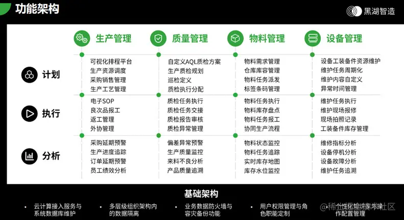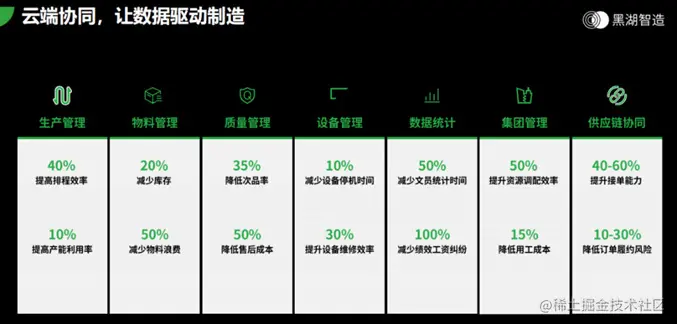 在这个趋势下,黑湖制造协同系统诞生了。黑湖智造是一款云端制造协同系统,通过数据和算法让生产更加高效。基于数据聚合、多角色协同、可视化分析、智能决策四大亮点,实现数据驱动下的精益制造。