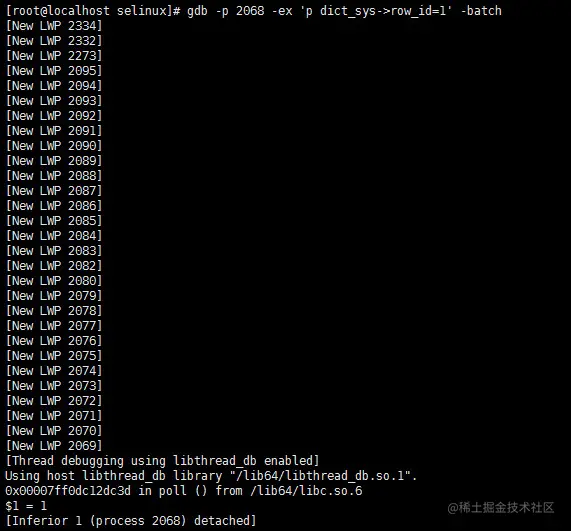 gdb -p 2068 -ex 'p dict_sys->row_id=1' -batch