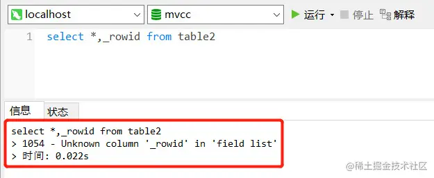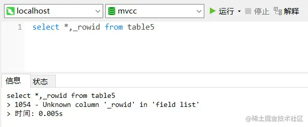 执行查询语句,在这种情况下,无法显式地查询到_rowid: