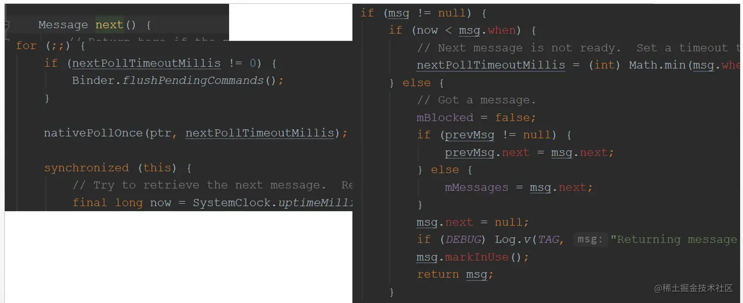 如果message中没有到期的消息,则调用native方法阻塞,(pipe管道),直到有message到期