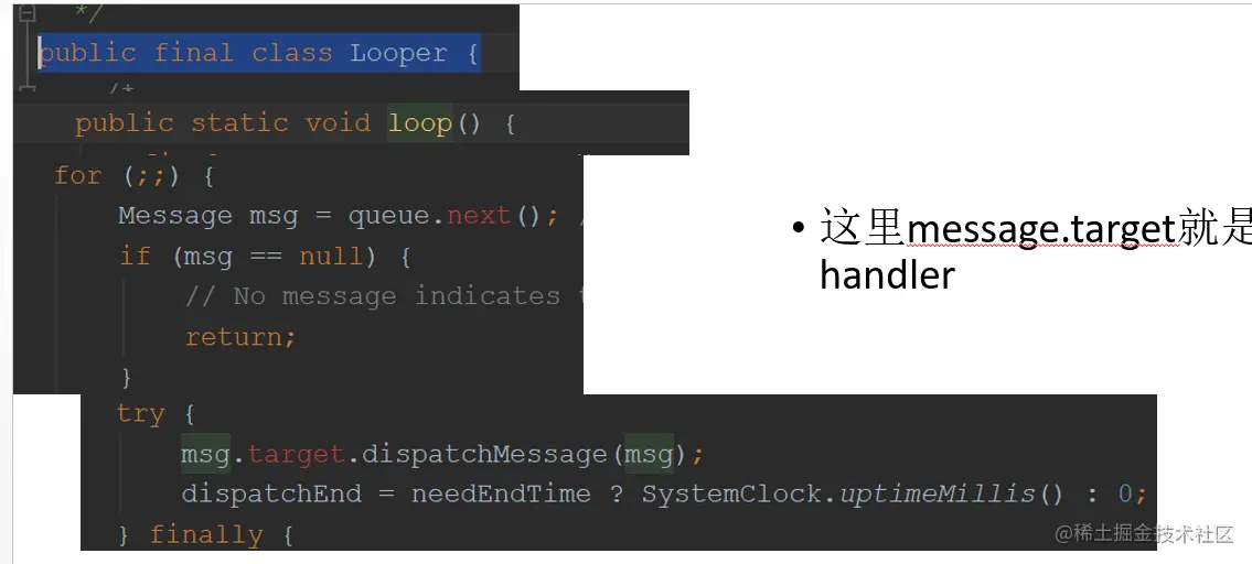 首先,looper.loop()中无限循环, 从MessageQueue中取,取到就交给handler的回调处理
