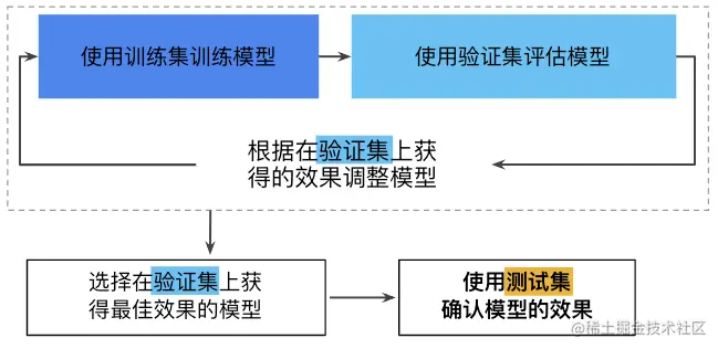 将数据划分成三份,分别为训练集/验证集/测试集。并按照如下流程: