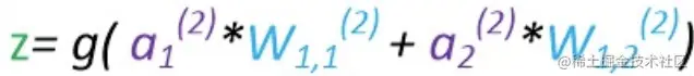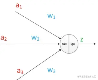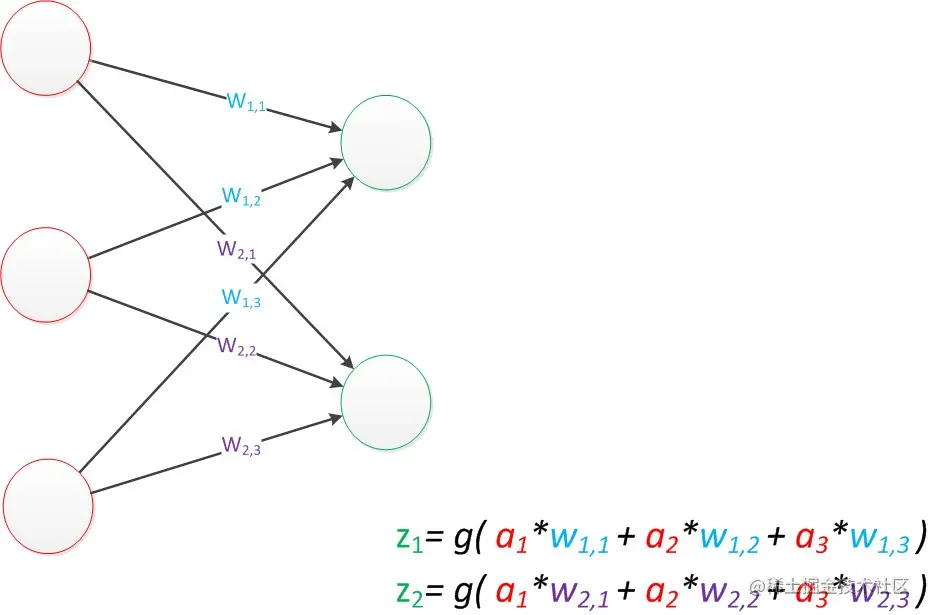从图中可以看出两个输出为z1 z2,输入为a1 a2 a3,g函数表示为sgn函数(MP模型所用的非线性函数)。 可以发现z1和z2就是线性代数方程组,输入向量为[a1,a2,a3]输出向量为[z1,z2],那么w就是个2行3列的矩阵。可以得到公式: