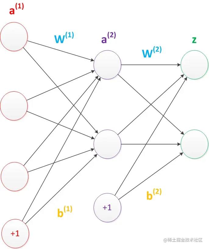 默认情况下,神经网络结果图并不会把偏置节点画出。而且到了两层神经网络以后,激活函数使用sigmoid 平滑函数来作为激活函数(也就是非线性函数)。