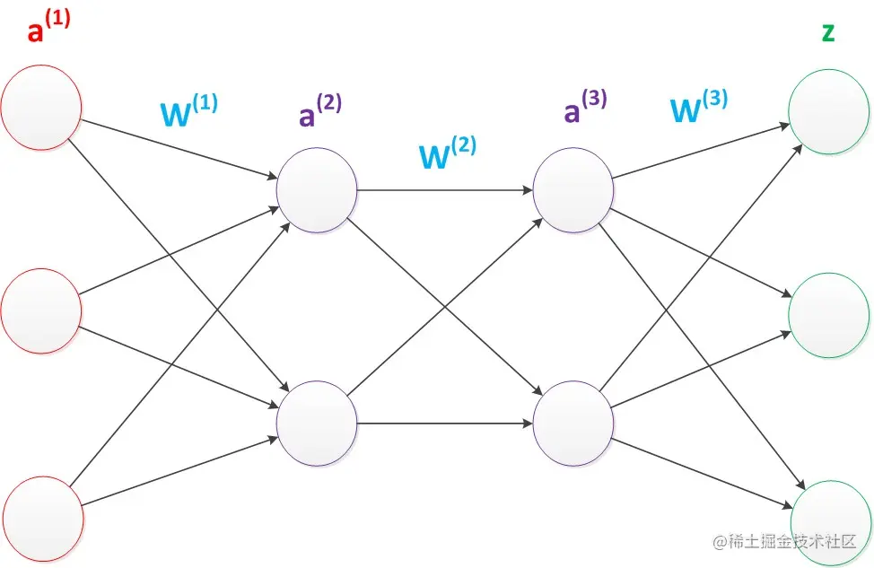输入输出矩阵公式为:(这里的a(1)代表的是所有输入向量,w(1)是权重向量,以此类推)