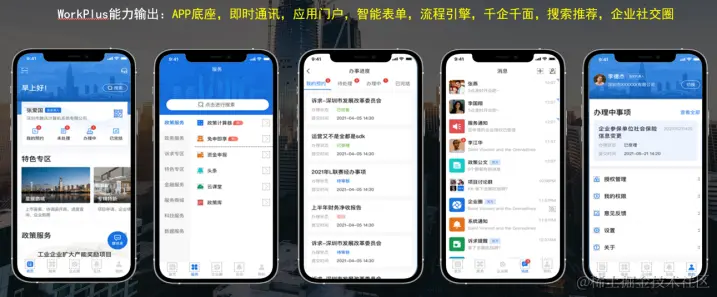 WorkPlus移动数字化平台集即时通讯、移动办公、业务协同、生态应用、服务于一体,以“移动门户”“私有化”“数字化赋能”为核心理念,多年来为各行各业的B端客户提供优质的定制化行业解决方案,以多种灵活方式支持私有云、混合云、专属云部署,提高数字化的核心驱动力。在智慧城市这个领域中,WorkPlus可以提供数智化解决方案、移动平台产品、集成交付、运维运营的全套集成服务,满足不同需求方对于门户统一、内容集成、千人千面工作台等方面千差万别的诉求,为城市的数字化移动业务画好蓝图、施工图,提高城市数字化的质效。