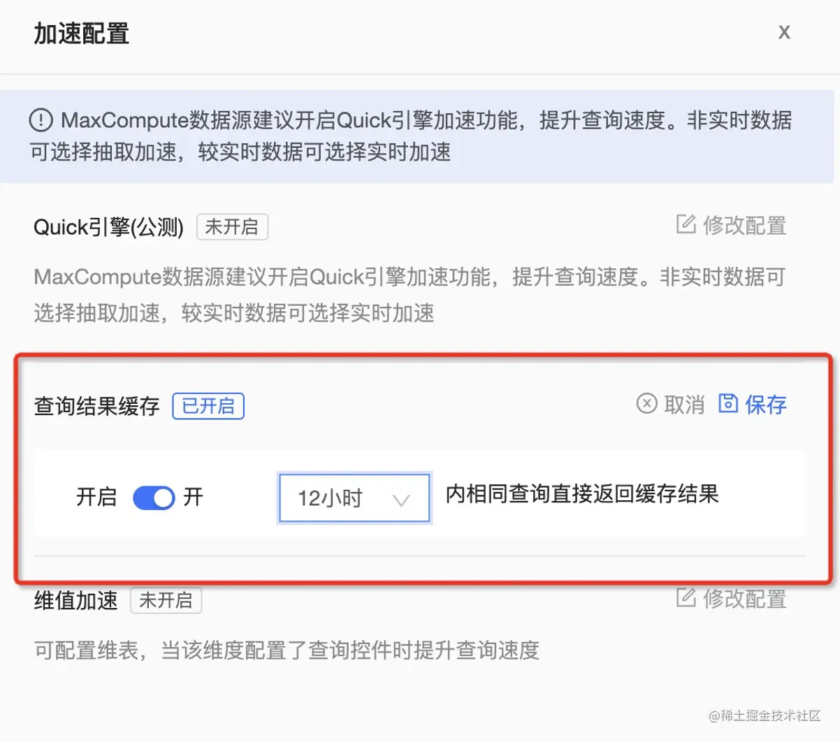 将用户已经查询过的结果缓存在 Quick BI 高速缓存组件内,一段时间内完全一致的查询可以直接返回查询结果。