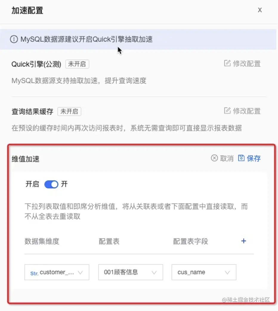 对于这类用户来说,他们可以在数据集的 Quick 引擎里开启实时加速, 通过引擎内置的 MPP 内存计算引擎,对数据进行实时的内存计算,从而达到加速的目的。