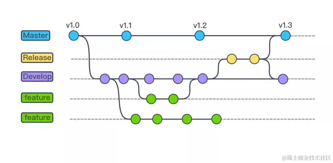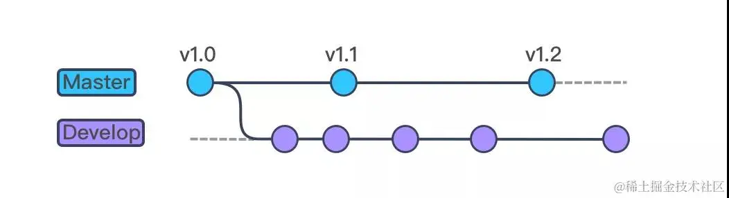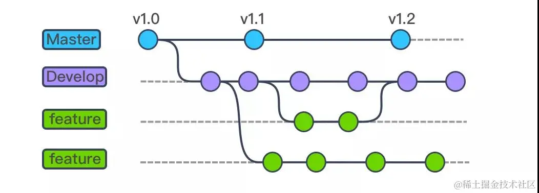Master 分支上每一个节点都代表了一个大版本,每一个大版本发布,都会把代码合并到 Master 上并打上相应的标签。Develop 分支主要是平时开发使用,每当一个需求进来,开发者要针对这个需求建立它的 Feature。
