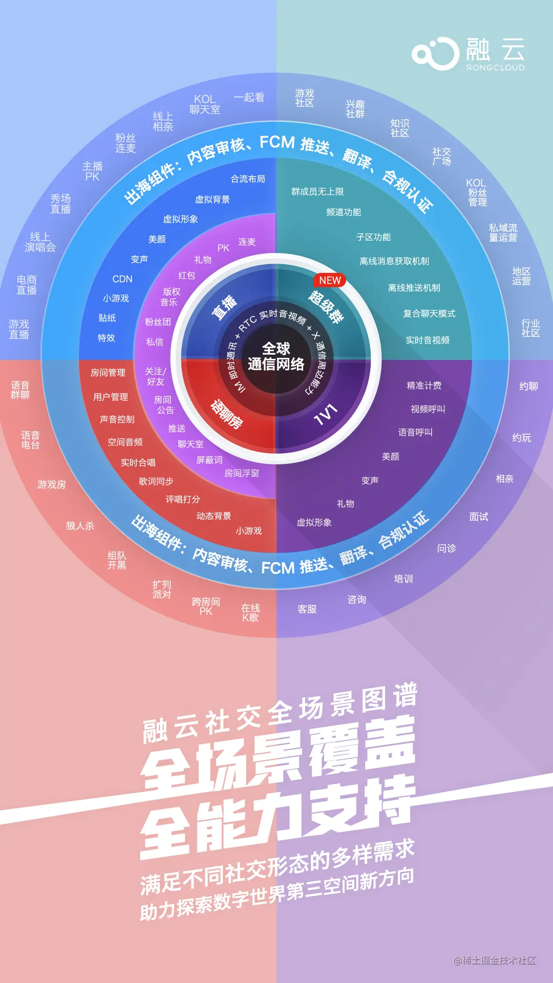 融云以“IM +RTC +X ”全通信能力为核心,打通社交全能力,覆盖社交全场景,将成为社交产品开发者最全能、最专业的伙伴。
