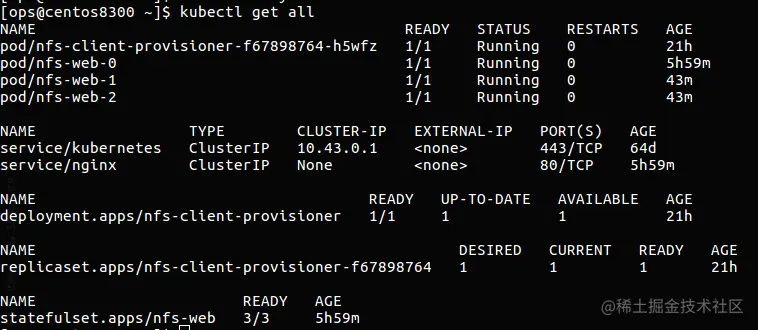 该provisioner将会自动创建pv,以 −namespace−{pvcName}-${pvName} 的命名格式创建在 NFS 服务器的 /mnt/storage 目录上。