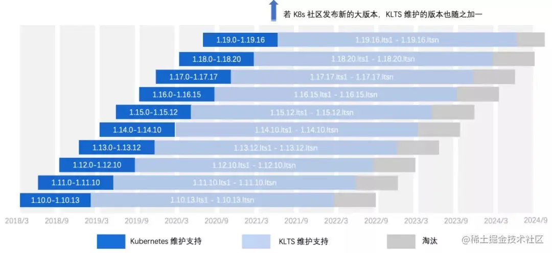 如上图所示,Kubernetes 社区对某个版本的维护周期通常是一年左右,而 KLTS 则是在接下来的三年内提供长期维护,直至代码无法兼容,才会将相应版本淘汰。