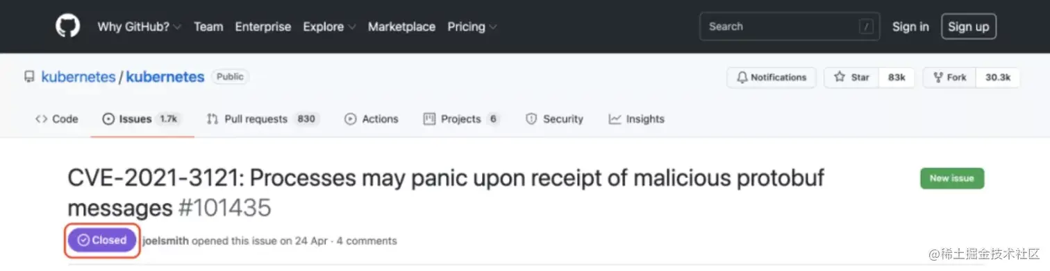 以 2021 年 1 月发现的 CVE-2021-3121 安全漏洞为例,CVSS 危急分数高达 7.5。但截止 2021 年 9 月 Kubernetes 社区: