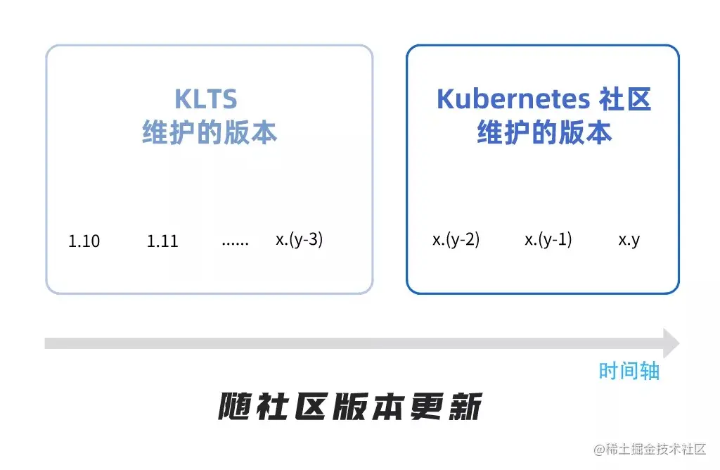 因此,根据社区版本维护声明,如果社区仅维护最近的三个版本,版本号即为 x.y、x.(y-1)、x.(y-2),而 KLTS 维护的则是从 1.10 起,到 x.(y-3) 的近十个早期版本,如下图所示。