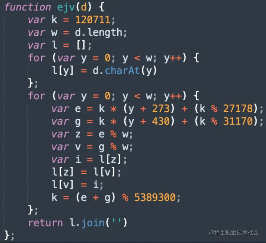 第一层去混淆由 ejv()完成,该函数将混淆数据的每个字符保存在数组中,执行算术运算进行解密。