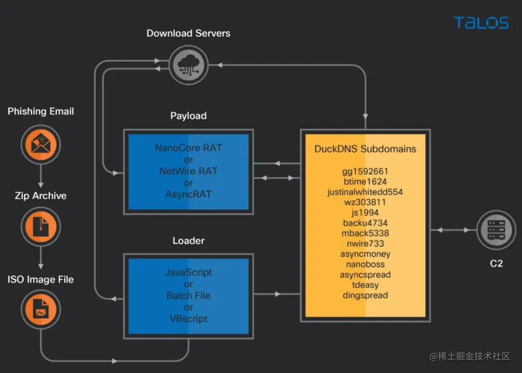 攻击者使用的远控木马是 Netwire、Nanocore 和 AsyncRAT,并且利用免费动态 DNS 服务 DuckDNS 注册了多个恶意域名。