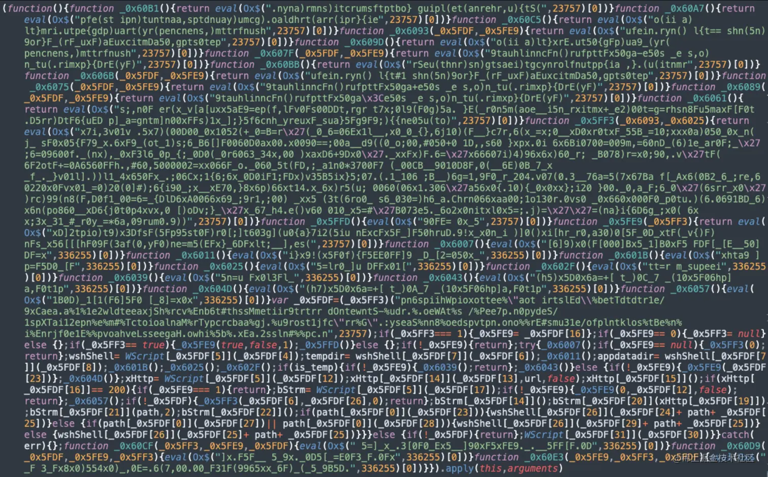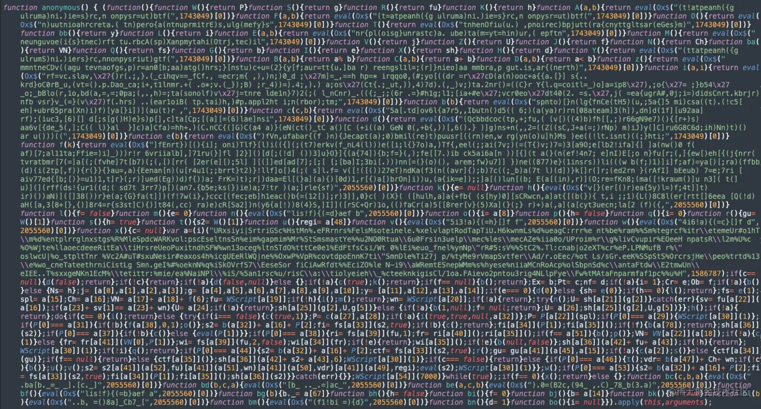 在分析另一个发现的 JavaScript 脚本时,与首次发现的不相同。这说明代码有可能是自动生成和随机化的,攻击者想通过高度混淆使检测变得更困难。