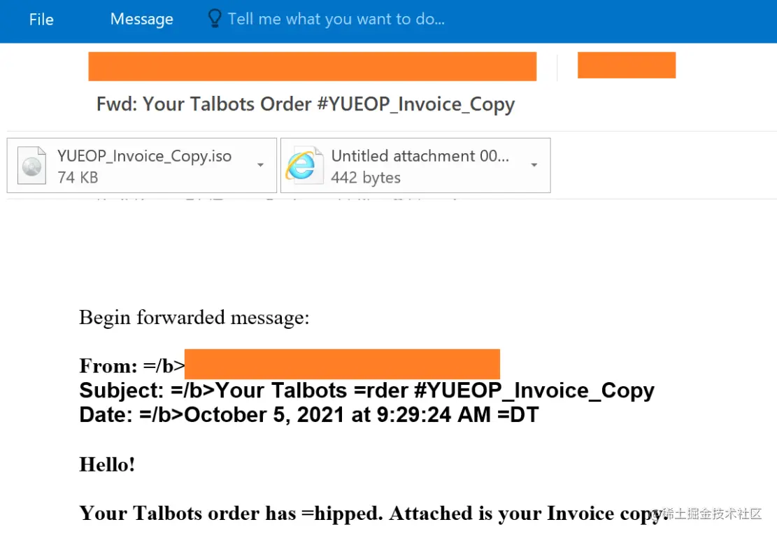 感染链起始的附件是一个 ISO 镜像文件,其中包含恶意的加载程序。如下所示,攻击者利用发-票文件来引诱用户点击打开: