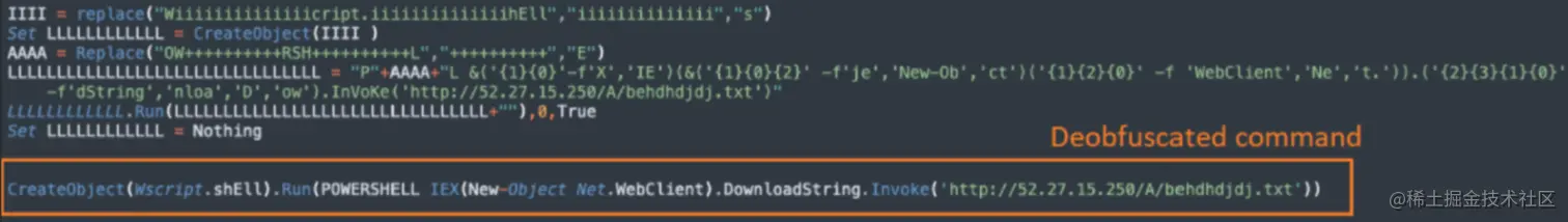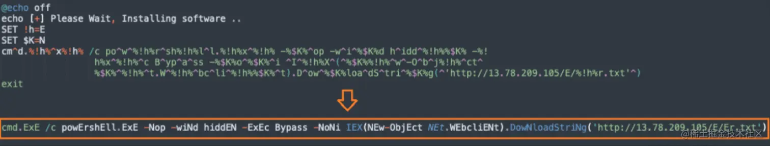 脚本中包含一个混淆命令,用以执行 PowerShell 下载攻击载荷,本例中通过 Azure Cloud 上的服务器 13.78.209.105进行下载。