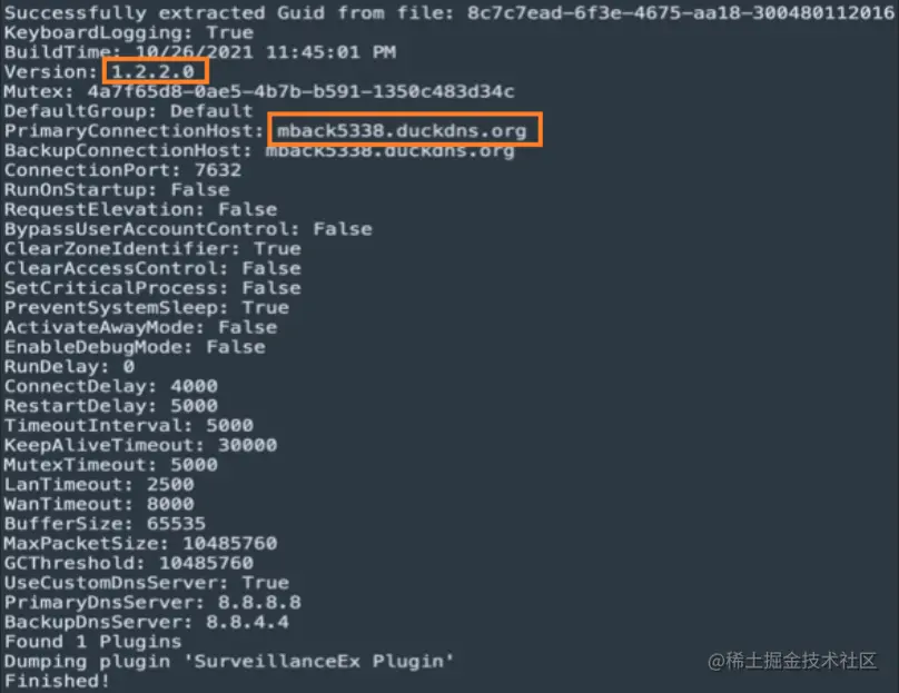 从发现的 Nanocore 样本中提取配置信息后,可以确认攻击者使用的是 1.2.2.0 版本(已泄露版本)的 Nanocore。样本的构建日期为 2021 年 10 月 26 日,使用的 C&C 服务器为 mback5338.duckdns.org。