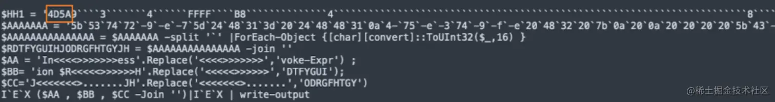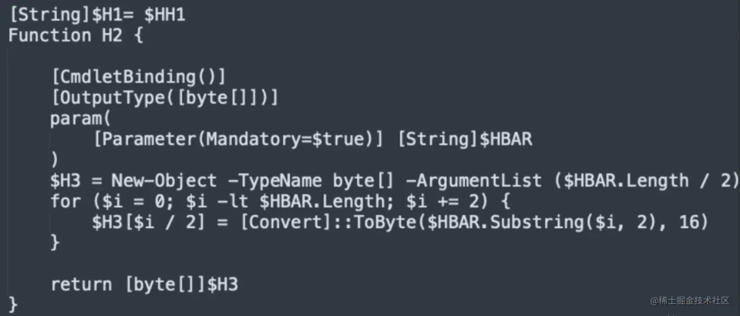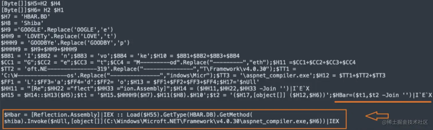 去混淆后的数据就是二进制文件本身。这个包含 Payload 的字符串,连同一个包含注入 .NET 程序 DLL 模块的字符串,一同被传递给函数 H2 转换为二进制字节数组。