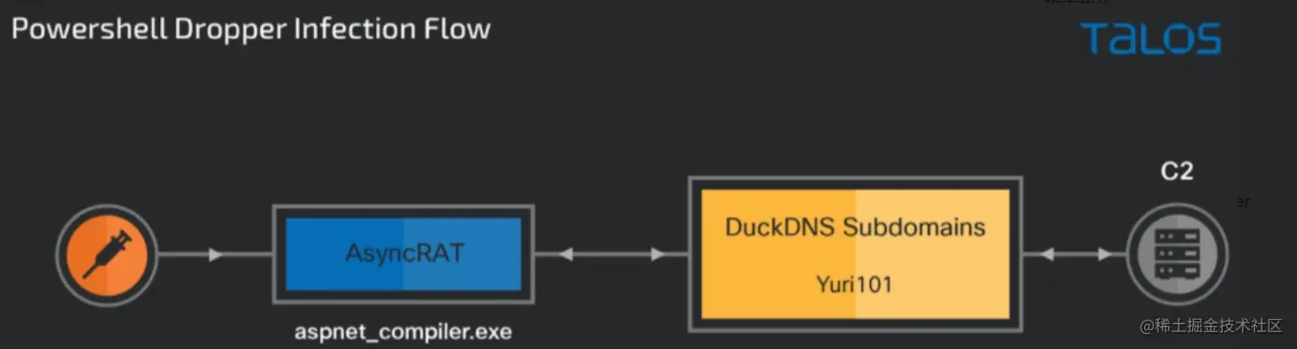 在 Azure 的服务器上发现了一个使用 HCrypt 构建的 PowerShell 脚本。该脚本会在失陷主机上下载并运行 AsyncRAT 的变种,类似的程序也被趋势科技的研究人员在名为 Water Basilisk的攻击中发现。