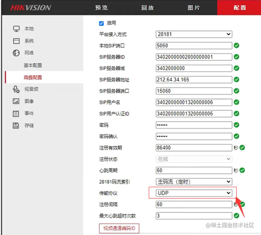 于是检测平台配置,发现用户设备配置的国标传输协议为UDP,但是EasyGBS配置的为TCP,故而导致视频不能播放。