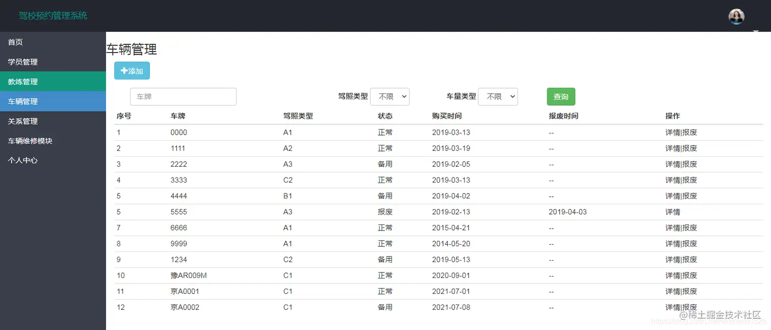 主要完成对车辆信息的添加,查询,修改操作,点详情进入修改页面,点报废可以修改车辆的使用状态