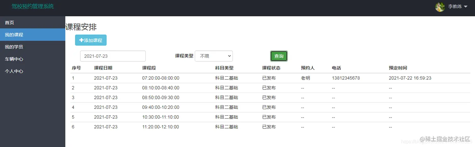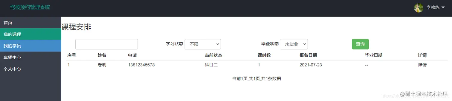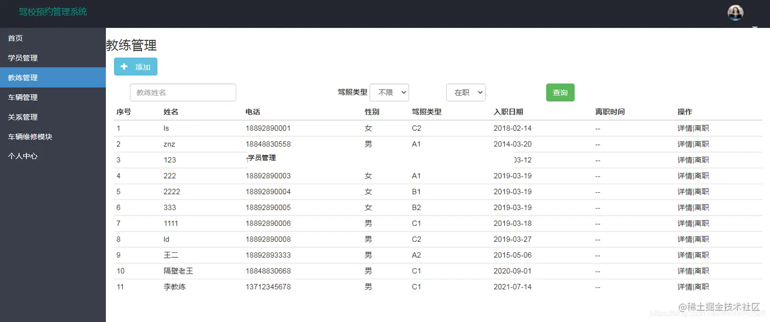 主要完成对教练信息的添加,查询,修改操作,点详情进入修改页面,点离职可以修改教练的在职状态