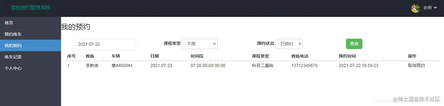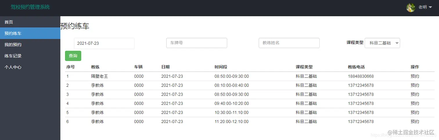 本项目基于SSM框架而成,完成了一个驾校预约练车管理系统,主要包含三个系统角色:管理员角色、教练角色、学中角色。管理员主要实现对学员管理、教练管理、车辆管理、维修管理等相关的管理操作。教练主要实现自己的课程管理、查看预约练车的学生、上报维修车辆。学员主要实现在线预约练车,查看课程信息,个人信息管理等操作。本系统功能完整,界面美观大方,适合做毕业设计和课程设计使用。