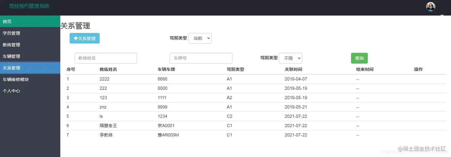 主要管理教练和自己所属车辆的对应关系