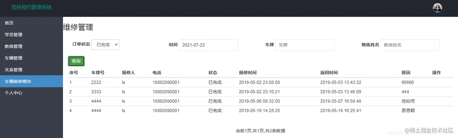 主要查看和管理车辆维修情况,修改维修完成状态