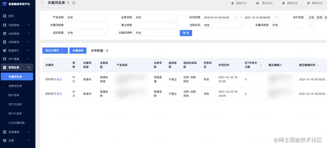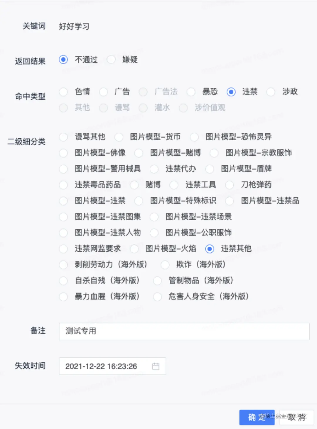 在进行通话之前,我们提前配置了部分敏感词作为审核过滤条件。