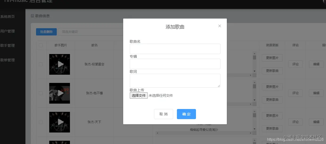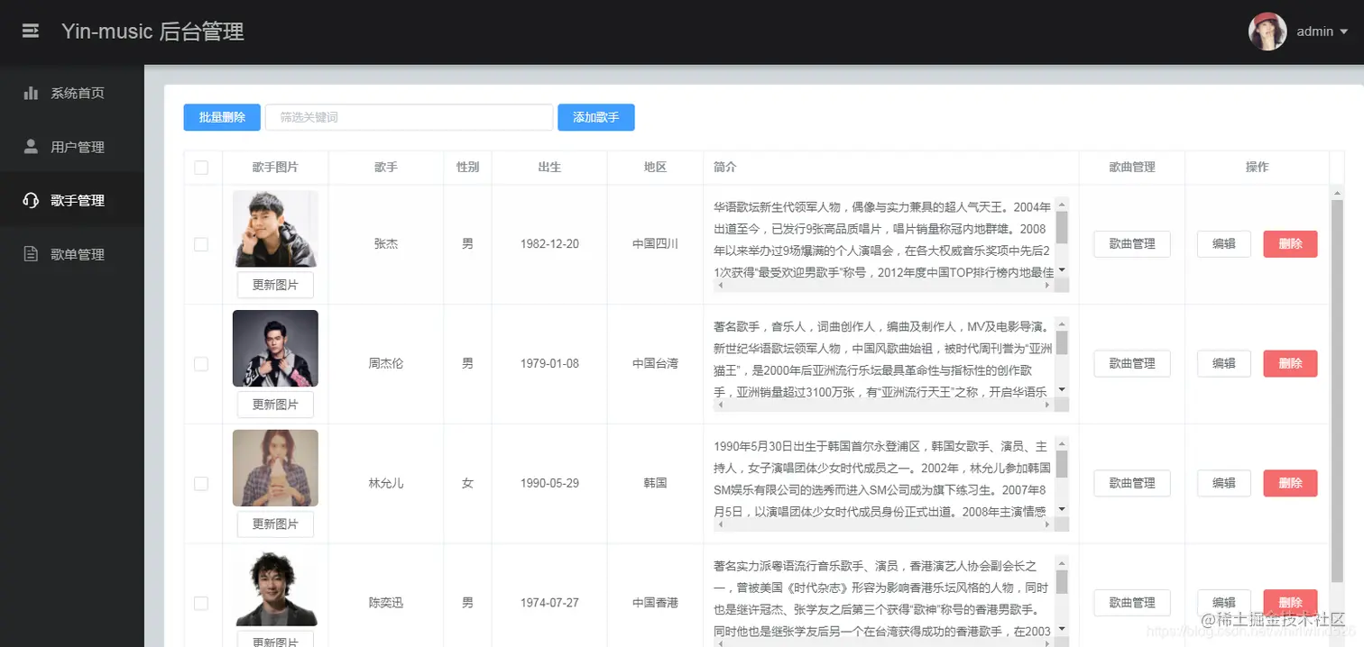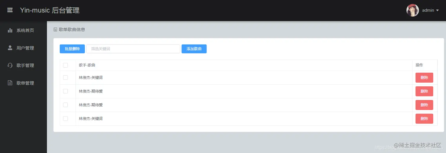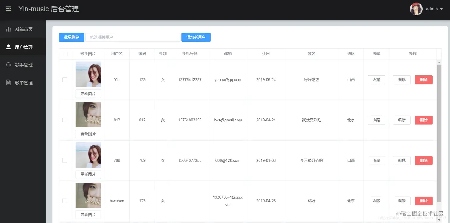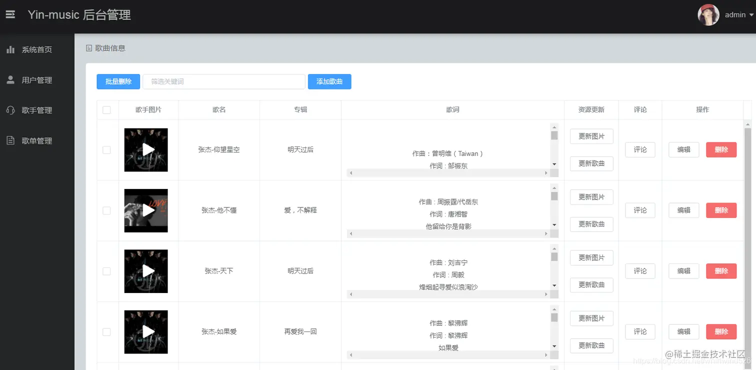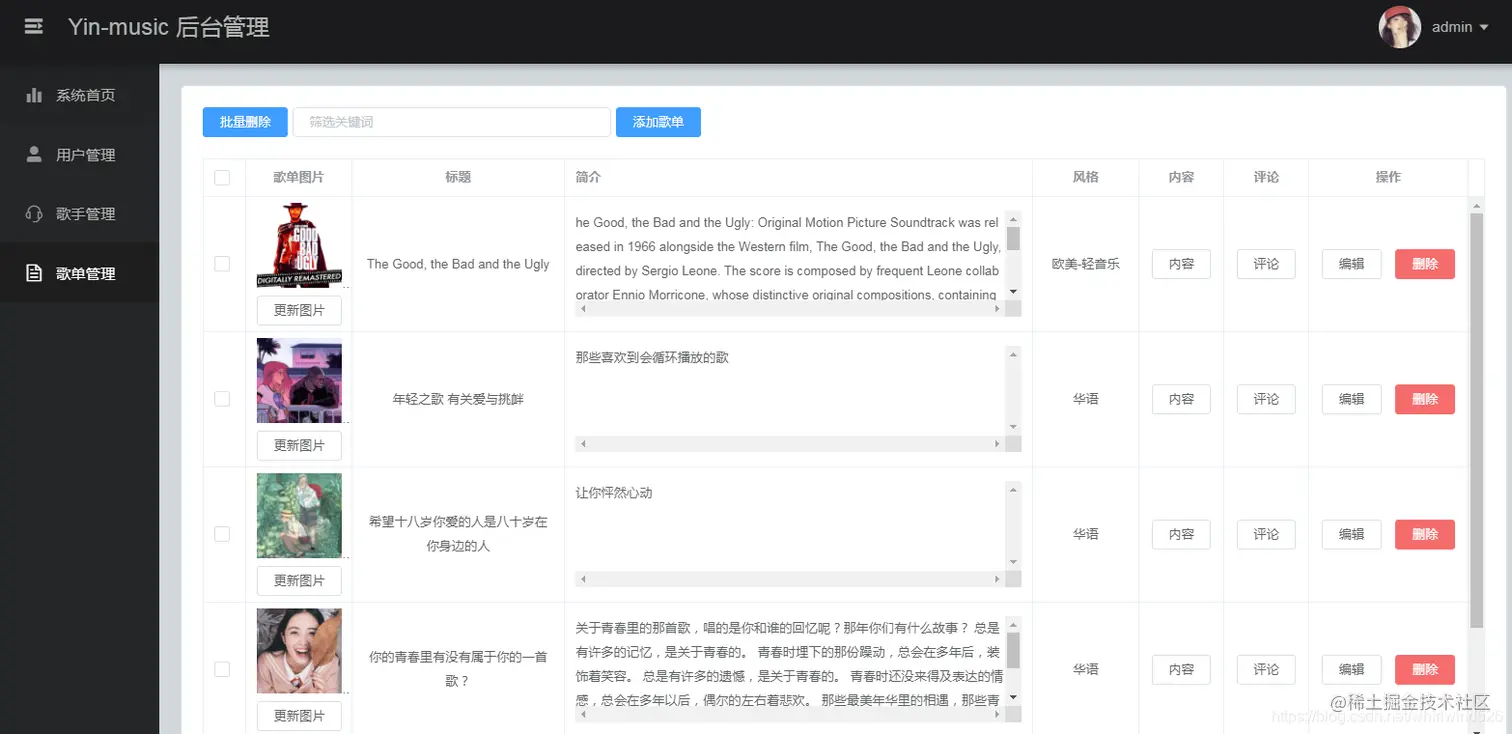 - 后台对用户、歌曲、歌手、歌单信息的管理