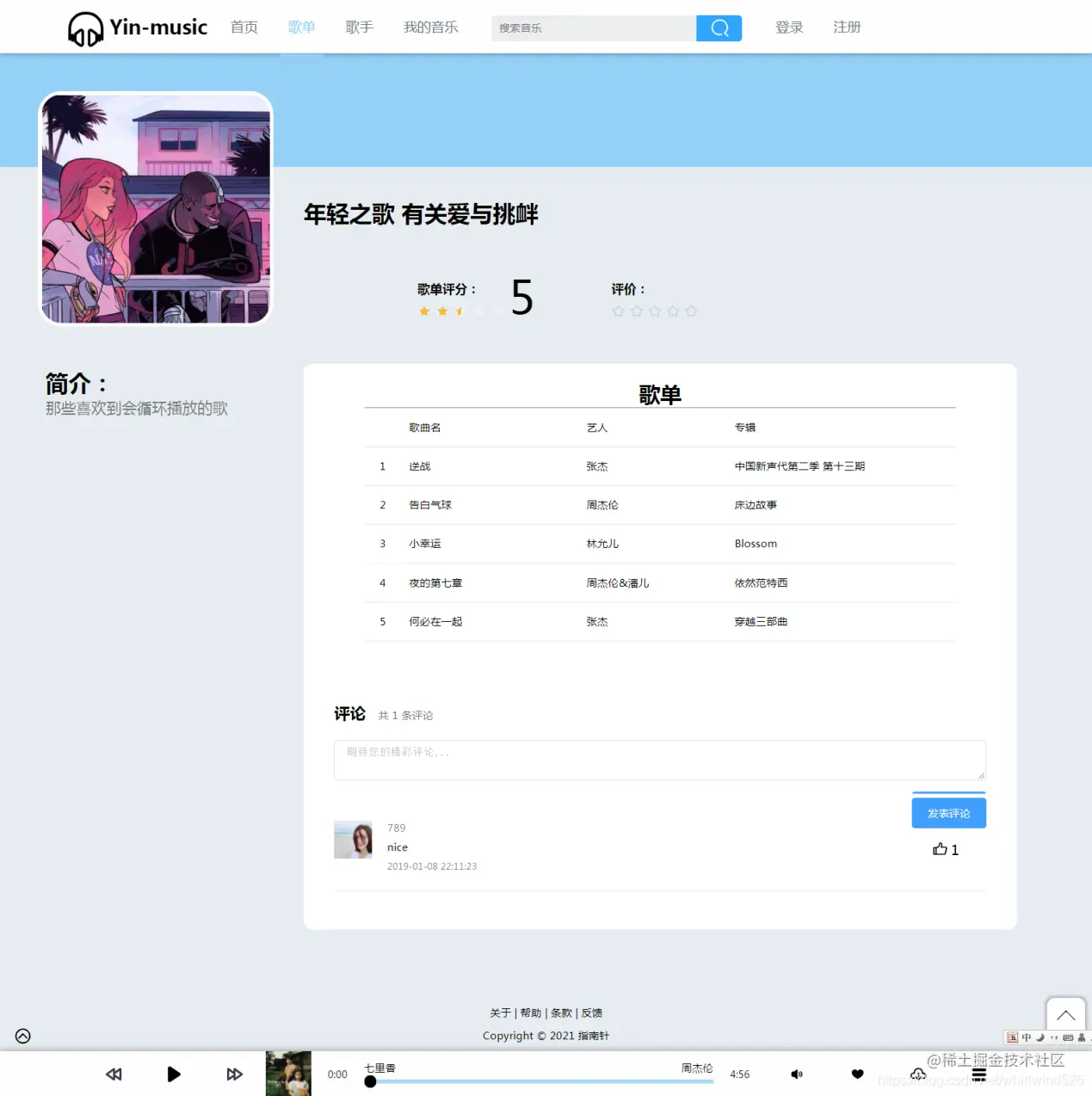 可以查看歌单的哥曲列表并进行播放,同时可以做出自己的评论,并可以进行星级评价。