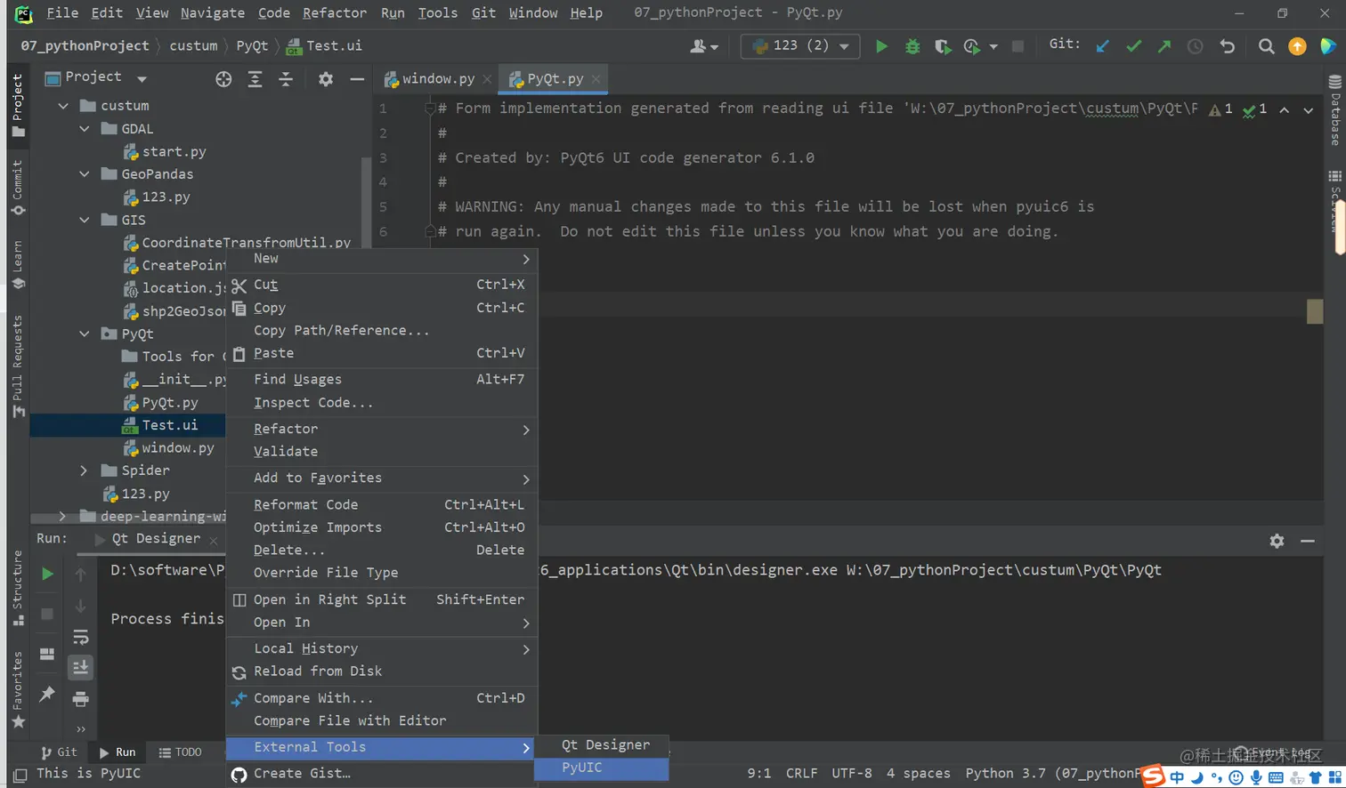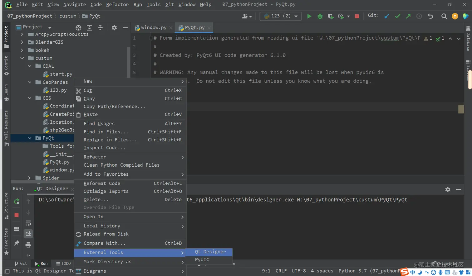 在工作文件夹上右击,依次点击External Tools-> Qt Designer