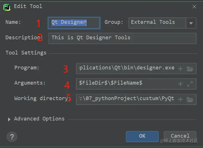 - 3 这里填写你安装好的**PyQt Designer.exe*的绝对位置,我的位置如下,大家可以参考去找自己