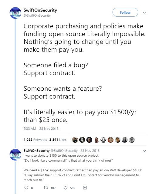 问题是,不支付维护者的费用会产生负面影响。就拿最近的一个案例来说,一个开发者把他的开源项目交给了另一个人,然后他用它来偷比特币。