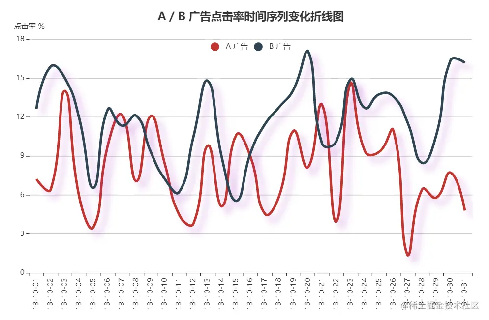 title = 'A / B 广告点击率时间序列变化折线图',