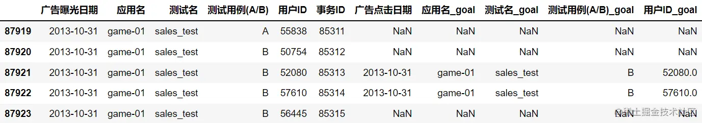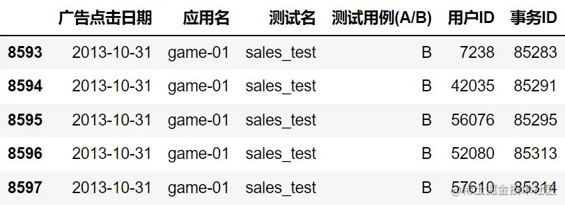 goal_df.columns = ['广告点击日期', '应用名', '测试名', '测试用例(A/B)', '用户ID', '事务ID']