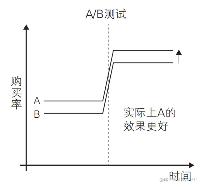 A/B 测试能够在多个选项中找出那个能够带来最佳结果的选项。在本例中,我们只要同时投放广告 A 和广告 B,就可以排除其他外部因素的干扰,但要注意用户分组必须遵循随机原则。