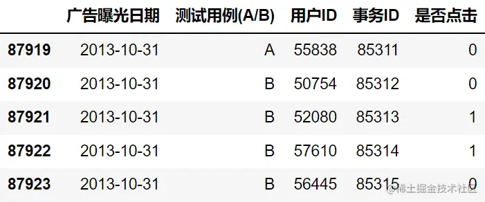 all_df = all_df.loc[:, ['广告曝光日期', '测试用例(A/B)', '用户ID', '事务ID', '是否点击']]