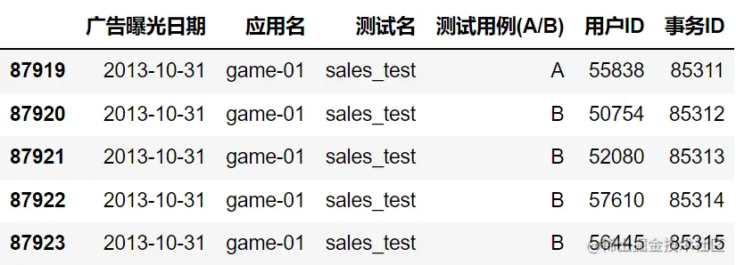 imp_df.columns = ['广告曝光日期', '应用名', '测试名', '测试用例(A/B)', '用户ID', '事务ID']