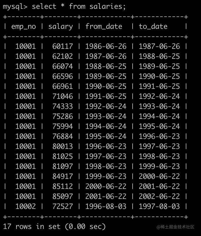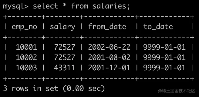 有一个薪水表,salaries简况如下: