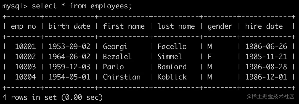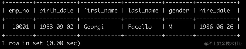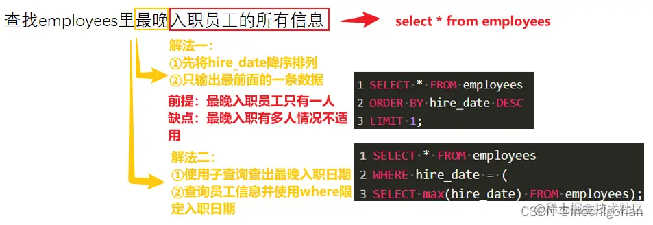 查找employees里最晚入职员工的所有信息,以上例子输出如下: